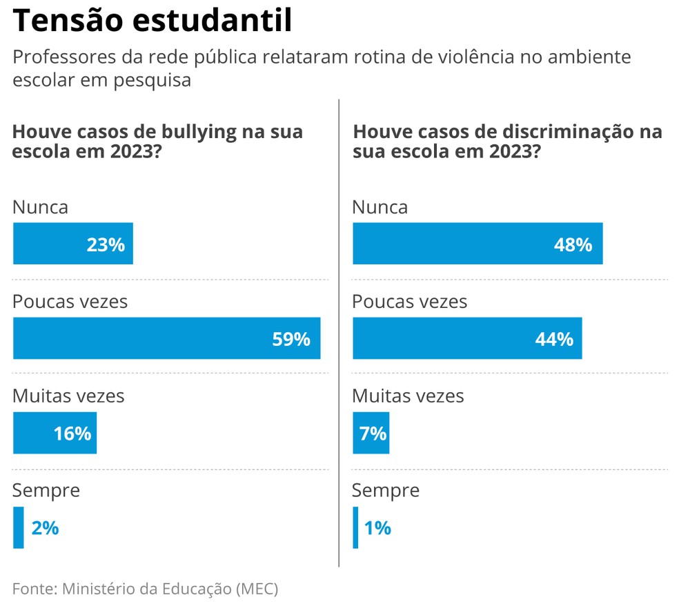 Os dados, recolhidos pelo questionário destinado a professores de Português e Matemática na aplicação do Sistema de Avaliação da Educação Básica (Saeb), apresentam um cenário de escolas enfrentando graves conflitos de relacionamento — algo similar ao que se viu na série “Adolescência”, sucesso da Netflix. Eles mostram que somente 23% relataram não haver bullying (caracterizado pela pesquisa como ameaças ou ofensas verbais) em sua escola naquele ano, enquanto 59% disseram haver poucas vezes, 16% muitas vezes e 2% informam que sempre há casos desse tipo.