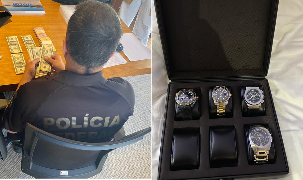 Dólares e relógios encontrados pelos agentes durante as buscas — Foto: Polícia Federal/Divulgação