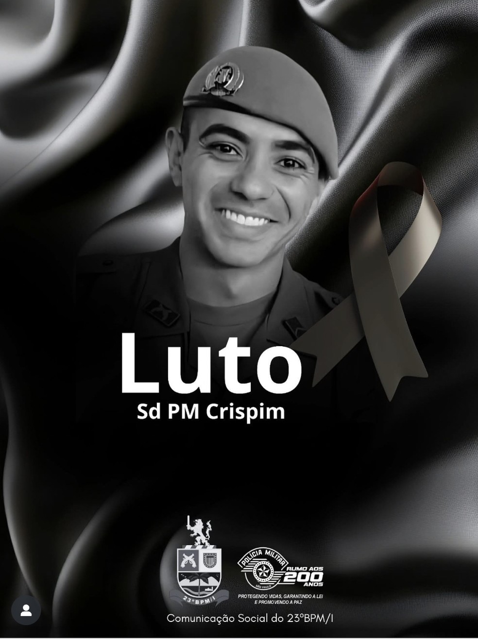 “É com profundo pesar que o Comandante do 23º Batalhão de Polícia Militar do Interior, Ten Cel PM Rodrigo dos Santos Iacovantuono, informa o falecimento do Soldado PM Luiz Guilherme Crispim de Oliveira, integrante da 4ª Companhia desta Unidade.