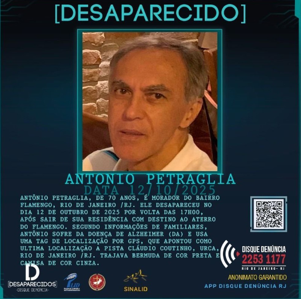 Antonio Petraglia desapareceu após sair para sua caminhada habitual. Diagnosticado com Alzheimer, o professor costumava fazer passeios curtos por recomendação médica, usando um colar de identificação e um AirTag, dispositivo eletrônico usado para rastrear objetos pessoais. Ele foi visto pela última vez, no domingo, dia 12 de outubro, entrando na pista Cláudio Coutinho, na Urca, por volta das 17h, segundo familiares. O idoso era monitorado por um aplicativo de localização, cujo sinal parou na área da trilha.