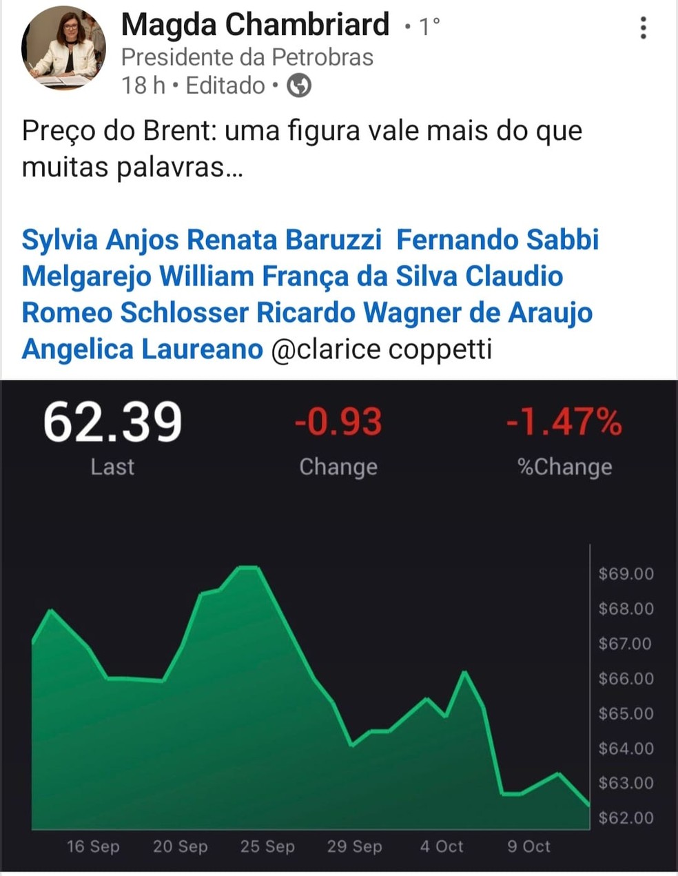 Com o preço do petróleo no mercado internacional se aproximando dos US$ 60, a presidente da Petrobras, Magda Chambriard, foi às redes sociais para comentar sobre o preço da commodity. Sem entrar em detalhes, ela afirmou que “uma figura vale mais do que muitas palavras”, ao postar um gráfico com a cotação do barril em queda.