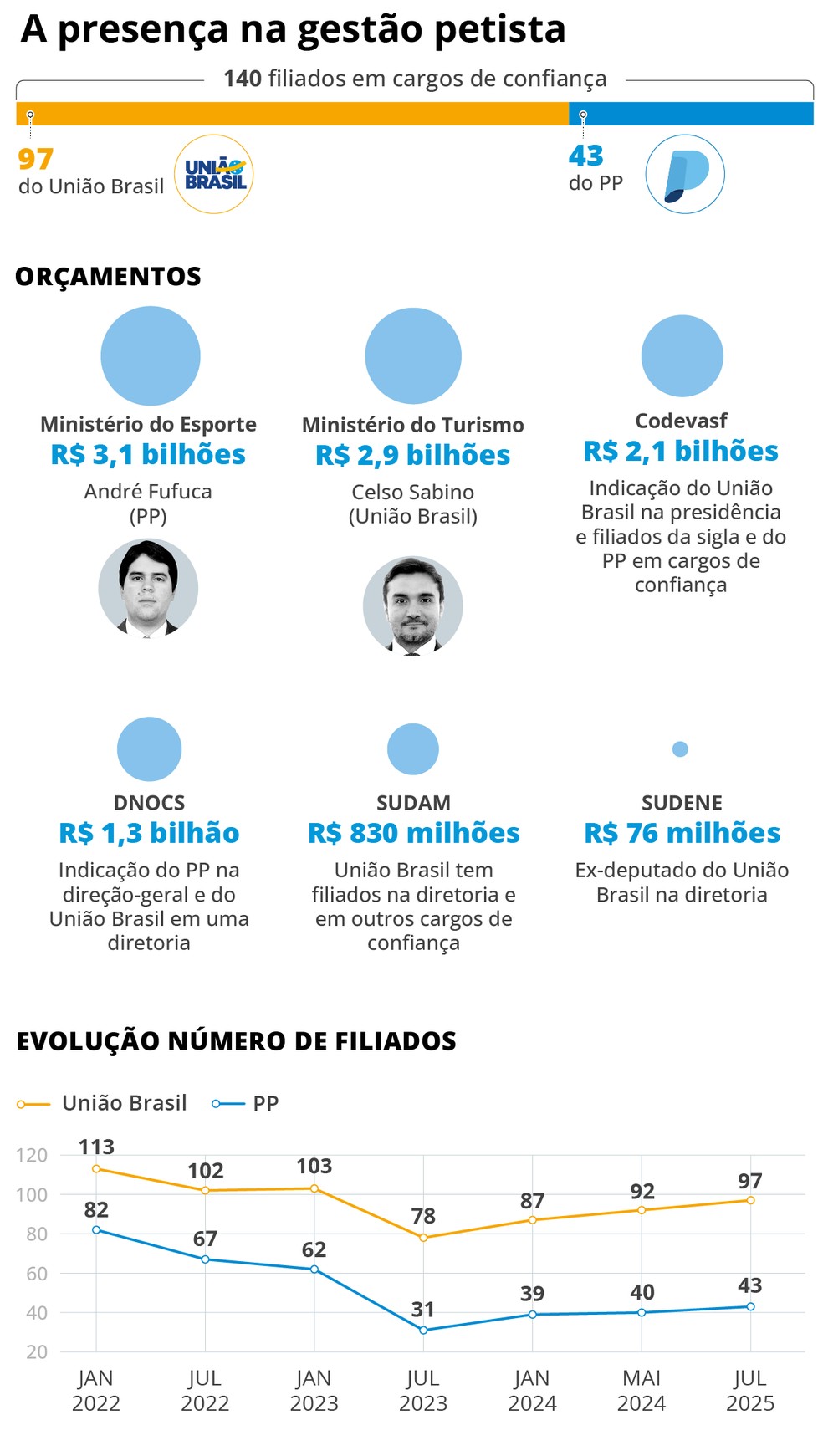 O União Brasil ainda tem cinco representantes na Superintendência do Desenvolvimento da Amazônia (Sudam) em cargos de diretoria, chefe de divisão e assessores. Em 2025, o orçamento do Fundo de Desenvolvimento da Amazônia, gerido pelo Sudam, é de R$ 830,5 milhões. Há ainda integrantes das legendas em cargos no Palácio do Planalto, em órgãos como a Fundação Nacional do Índio (Funai) e também em superintendências estaduais do Ministério da Saúde.