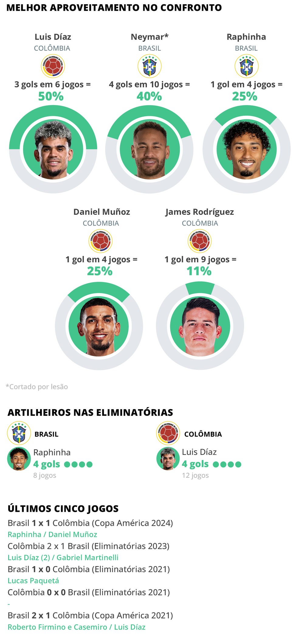 Maior artilheiro da seleção, Neymar sabe bem como é ser algoz dos rivais sul-americanos. O craque balançou as redes quatro vezes em dez jogos contra a Colômbia, o que representa um aproveitamento de 40%. Cortado de última hora, ele não vai conseguir quebrar um longo jejum: a última vez que marcou no confronto foi em um amistoso que terminou empatado por 2 a 2, em 2019. Apesar do desfalque de peso, o Brasil conta com Raphinha, que fez seu único gol em quatro partidas diante dos colombianos, no empate em 1 a 1 pela Copa América de 2024.