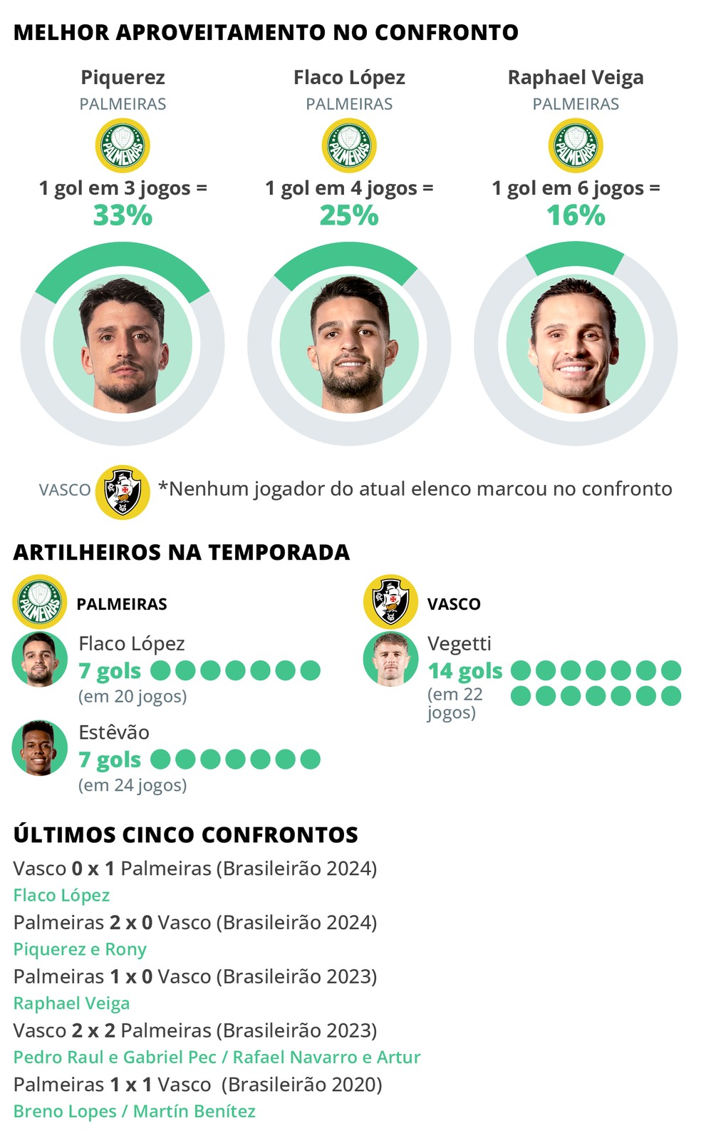 Sem saber o que é ganhar do Palmeiras desde 8 de novembro de 2015, o Vasco não tem nenhum jogador do atual elenco que balançou as redes no confronto. Já o rival conta com três atletas que tentam novamente virar “carrasco”: Piquerez, Flaco López e Raphael Veiga. O lateral-esquerdo fez um gol em três jogos, o que representa um aproveitamento de 33%. Enquanto o atacante e o meia também têm a mesma marca, só que com quatro e seis partidas, respectivamente.