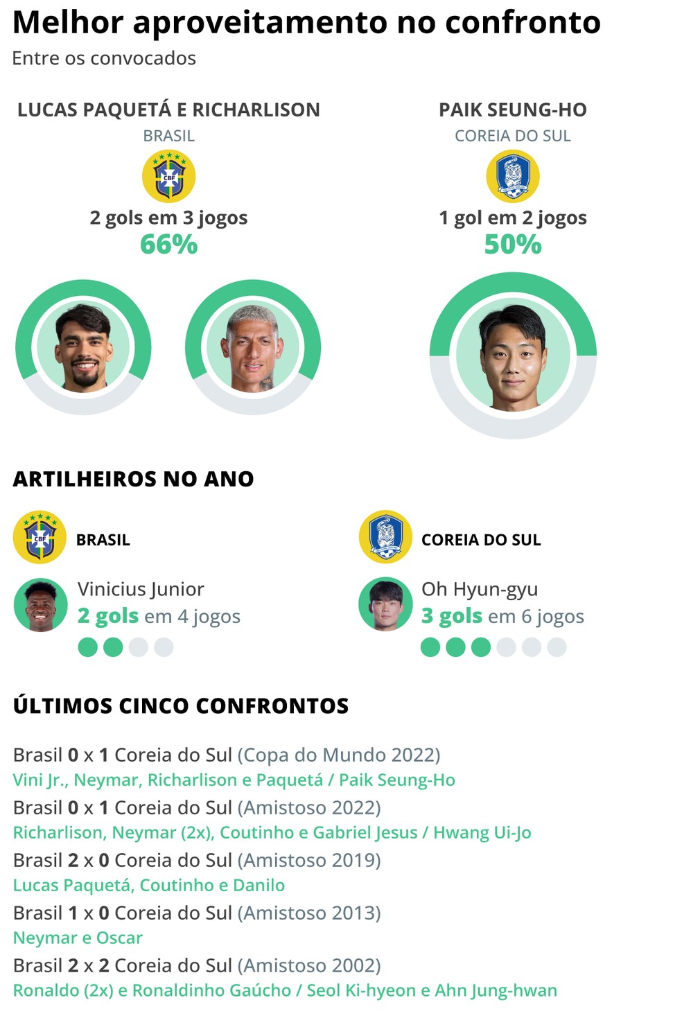Entre os convocados da seleção brasileira, Lucas Paquetá e Richarlison são os que têm melhor retrospecto diante dos sul-coreanos. Cada um marcou dois gols em três jogos, um aproveitamento de 66%. Ambos foram decisivos nas vitórias do Brasil por 4 a 1, na Copa do Mundo de 2022, e por 5 a 1, no amistoso de 2022.