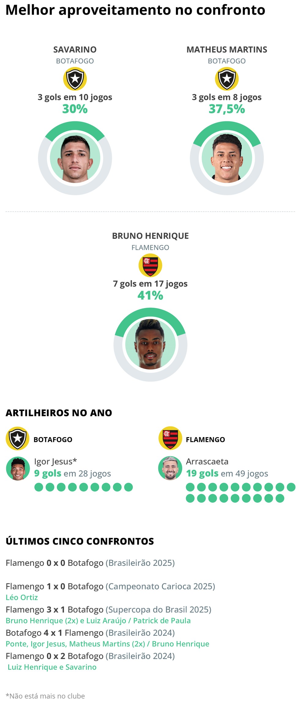 Entre os jogadores do Botafogo, Savarino e Matheus Martins se destacam quando o adversário é o Flamengo. O venezuelano marcou três gols em dez partidas contra o rival (30%), enquanto o jovem atacante tem três gols em oito jogos, um aproveitamento de 37,5%.