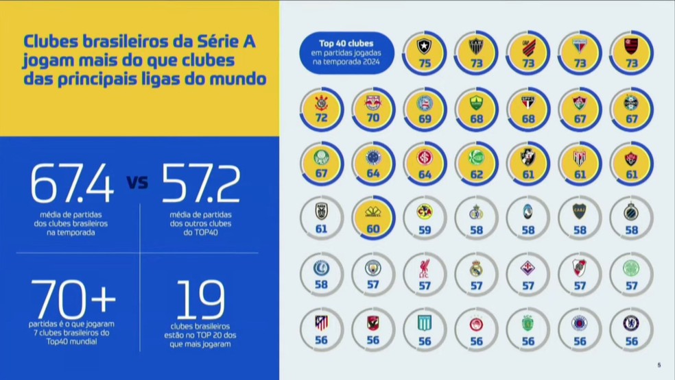 A Confederação Brasileira de Futebol anunciou nesta quarta-feira diversas alterações no calendário nacional de futebol a partir de 2026. Um dos principais objetivos da entidade foi reduzir a quantidade de jogos dos times na temporada. O presidente Samir Xaud, inclusive, exibiu um slide mostrando que as 19 equipes que mais jogaram em 2024 eram do país (com Botafogo, Atlético-MG, Athletico-PR, Fortaleza e Flamengo liderando a lista, com 73 partidas).