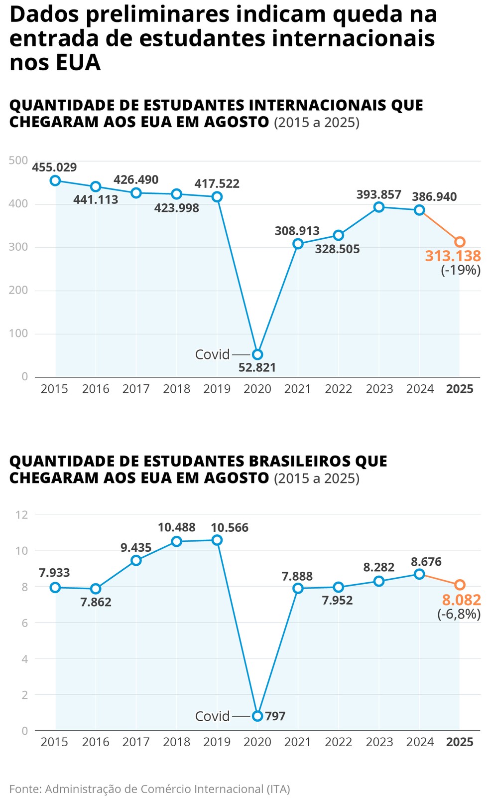 O número de estudantes internacionais que chegaram aos Estados Unidos em agosto caiu 19% este ano em comparação com o ano passado — o maior declínio já registrado fora da pandemia. A quantidade de estudantes brasileiros diminuiu 6,8% em relação a agosto de 2024. O mês de agosto é um indicador importante porque é quando a maioria dos estudantes internacionais chega aos EUA para o semestre de outono (no Hemisfério Norte) — já que não podem entrar no país mais de 30 dias antes do início das aulas —, que geralmente acontece entre o fim de agosto e o início de setembro.