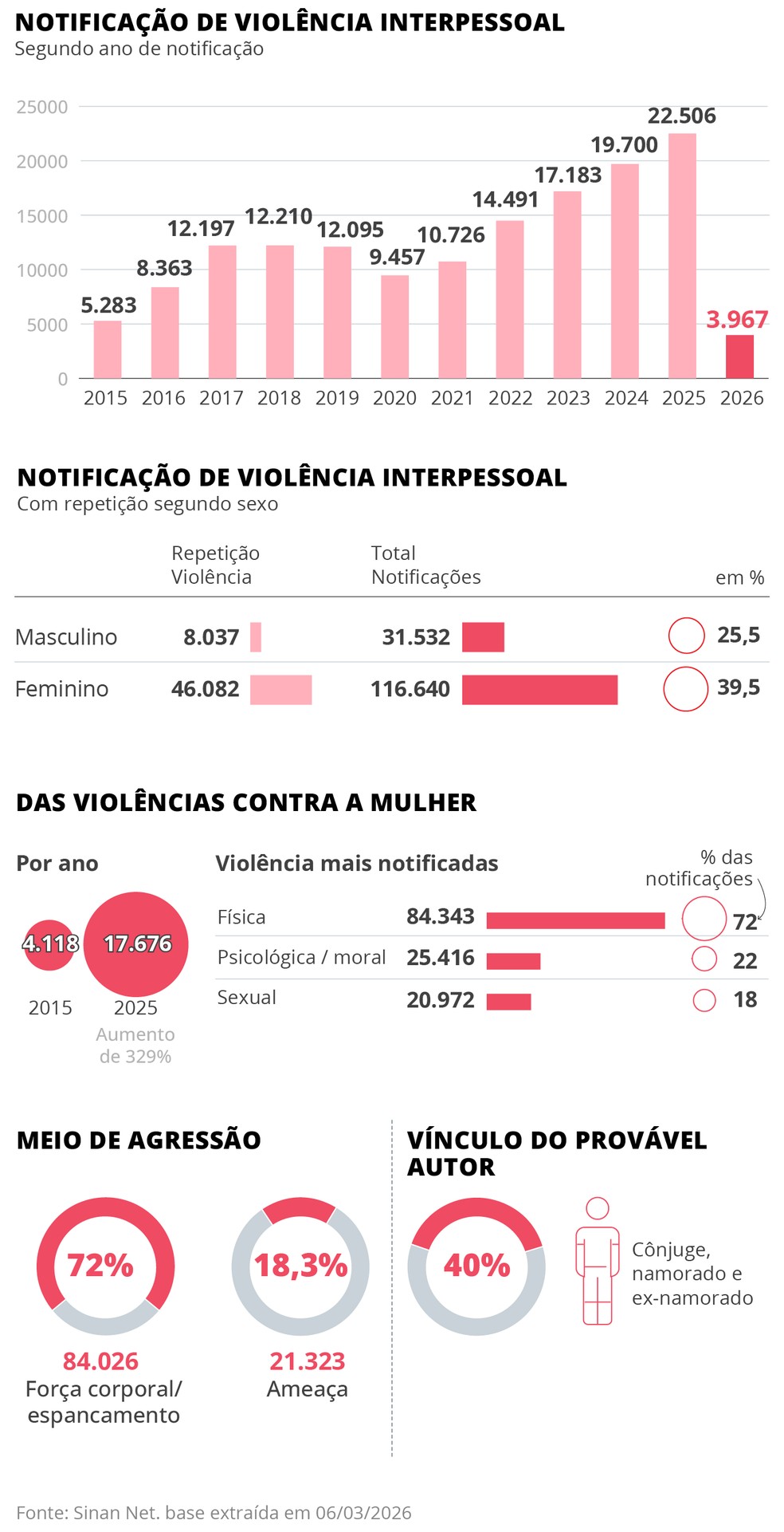 Os dados divulgados mostram que, entre 2015 e 2025, foram atendidas na cidade mais de 116 mil mulheres em hospitais e clínicas particulares e do governo. Dessas, 40% precisaram recorrer a unidades de saúde para buscar ajuda em mais de uma ocasião. A manicure Laila Monteiro, de 34 anos, tem dois filhos e conta que, por dez anos, sofreu violência física. Laila diz que só conseguiu romper esse ciclo de agressividade quando o filho mais novo a viu sendo espancada pelo pai: