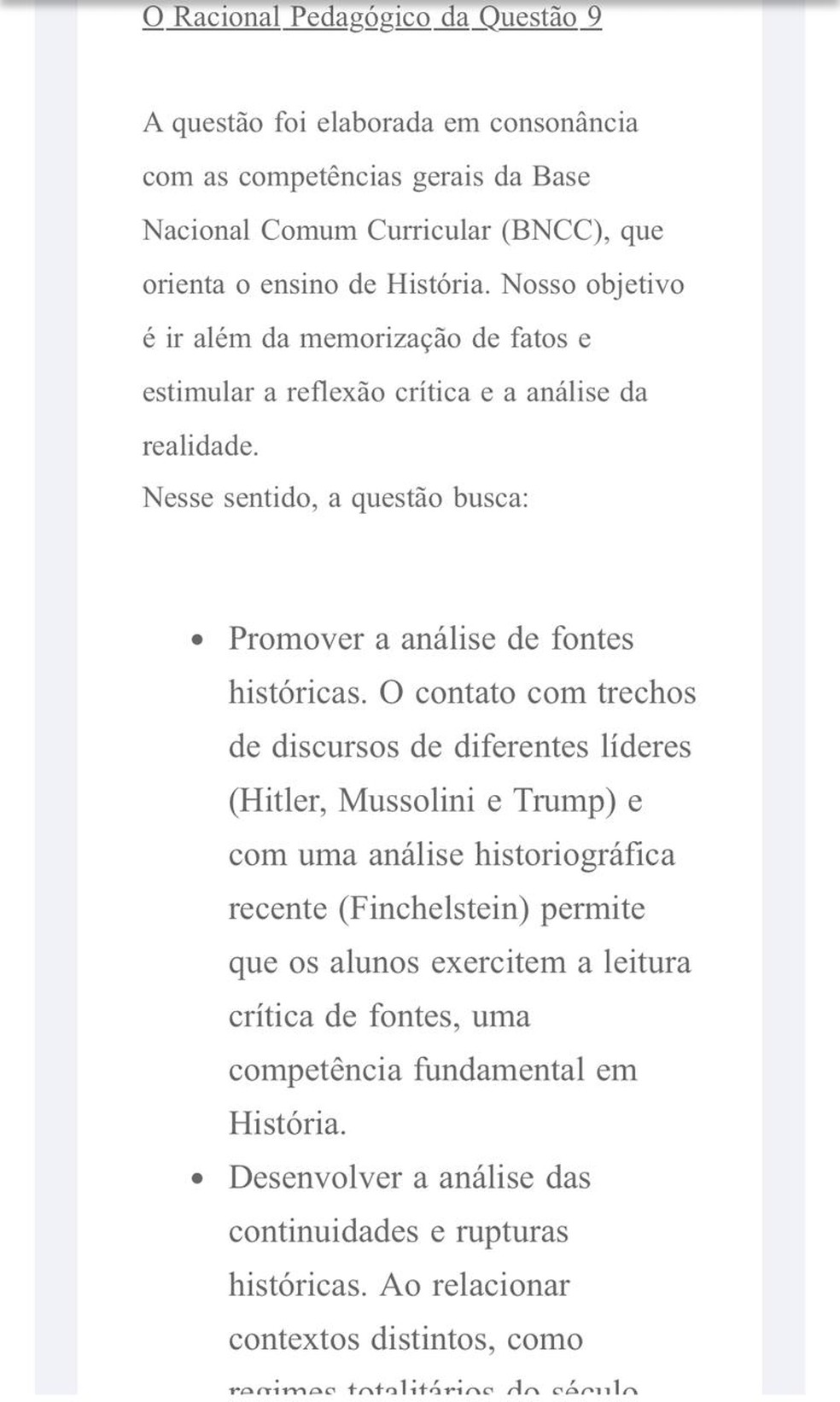 “A questão foi elaborada em consonância com a Base Nacional Comum Curricular, que orienta o ensino de História. Nesse contexto, a atividade promove a análise de fontes históricas e o contato com o discurso de diferentes líderes, permitindo que os alunos exercitem a leitura crítica de fontes.”