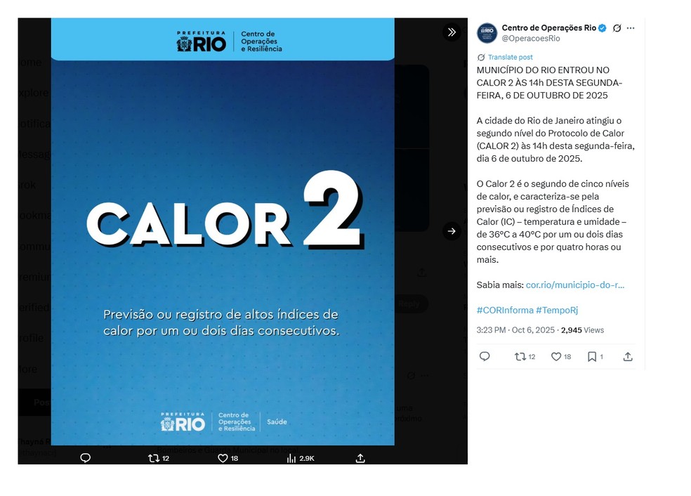 A cidade do Rio atingiu o nível 2 do Protocolo de Calor na tarde desta segunda (6). A marca corresponde ao segundo de cinco níveis de calor, e o registro é feito quando há Índices de Calor (IC), o que corresponde a temperatura e umidade, que variam de 36°C a 40°C por um ou dois dias consecutivos e por quatro horas ou mais. O modelo foi desenvolvido pelas secretarias de Saúde, Ambiente e Clima, além do Centro de Operações Rio (COR) e lançado em junho de 2024. As mudanças do primeiro para o segundo níveis do Protocolo de Calor não alteram os estágios operacionais da cidade.
