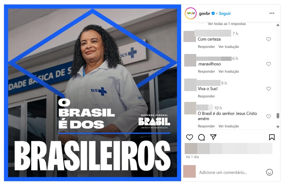 O conteúdo patrocinado pela Secom mostra uma médica vestindo um jaleco do SUS, diante de uma Unidade Básica de Saúde. Junto dela, aparecem os dizeres: “O Brasil é dos brasileiros” — frase elaborada por Sidônio no início de sua gestão na pasta, e estampada até em bonés. Na legenda das publicações, a conta do Governo do Brasil afirma: “Esse é o Brasil do cuidado: onde a dedicação de quem cuida faz a saúde chegar a todos” (veja abaixo). Beleza.