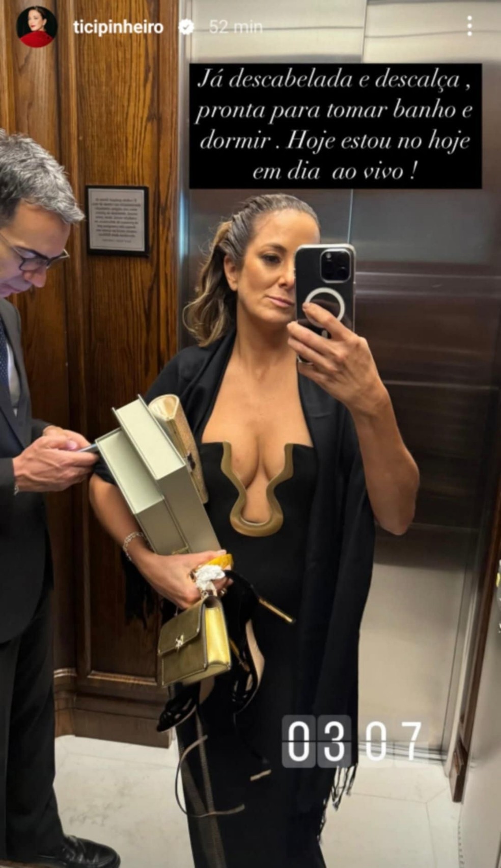 Ticiane entrou ao vivo no “Hoje em Dia”, da Record TV, poucas horas depois do evento. Nos stories do Instagram, a apresentadora compartilhou o contraste entre o glamour da festa e o cansaço no retorno ao trabalho.