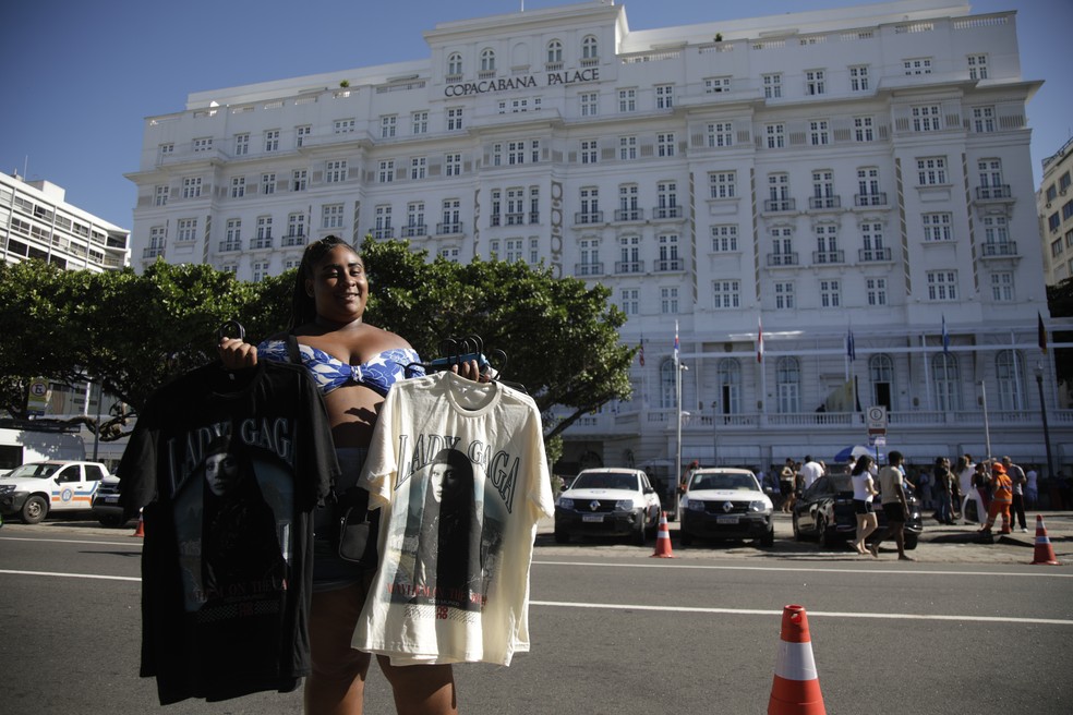 Desde a última segunda-feira, Sabrina Cipriano, de 22 anos e moradora de São João de Meriti, Baixada Fluminense, tem dormido com o marido dentro de um carro estacionado nos arredores do Copacabana Palace para não perder tempo com deslocamento numa das semanas mais importantes do ano: a do show de Lady Gaga, marcado para este sábado, dia 3. Mas ela está em Copa para mais do que assistir ao show. Às 9h da manhã desta sexta-feira, ela estava já na porta do Copacabana Palace, onde a cantora se hospeda, vendendo camisetas (“a partir de R$80, mas tem gente que chora para R$ 70”, diz ela), copos (R$ 20 cada) e doleiras (R$ 25) para os poucos fãs que passavam àquela hora.