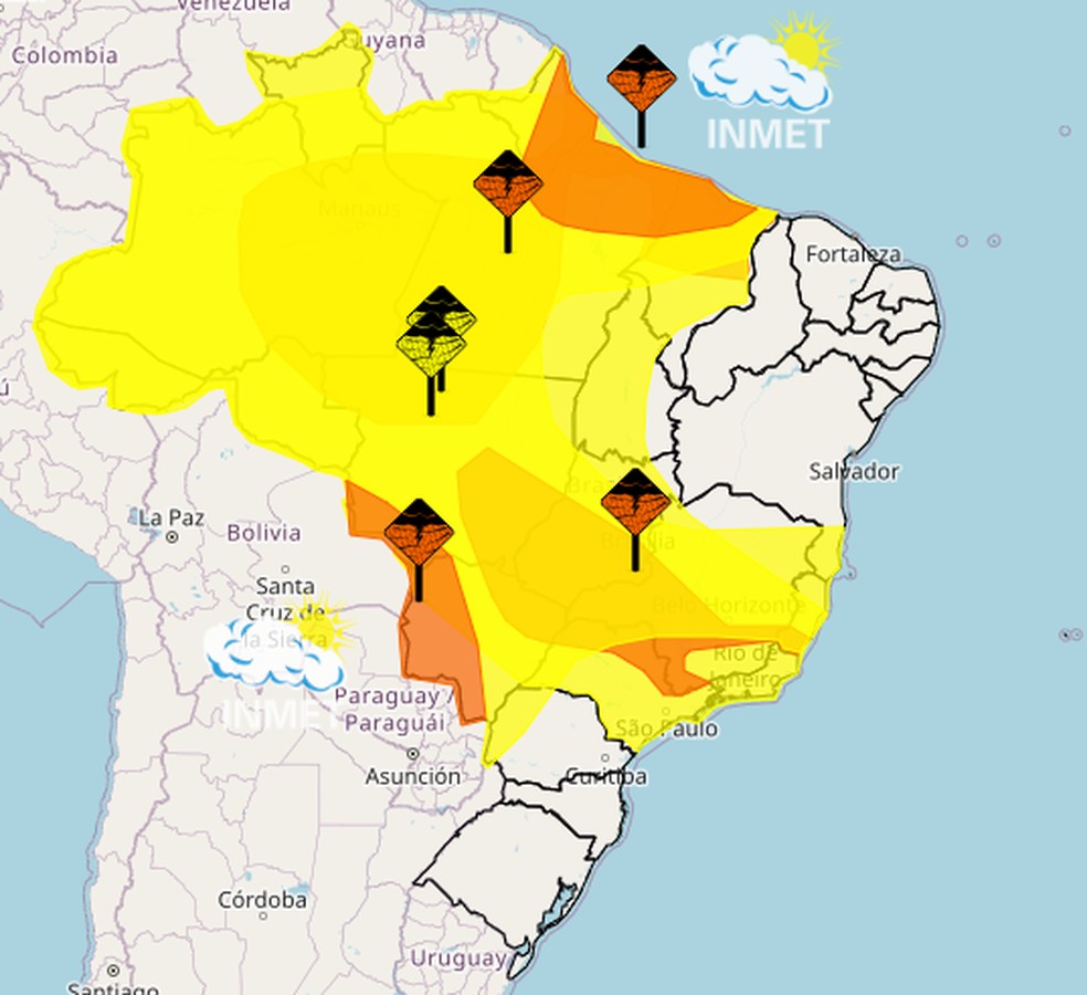 Quatro informes na escala laranja, de “perigo”, indicam chuvas entre 50 e 100 mm/dia e ventos intensos de até 100 km/h no Norte, além do Centro-Oeste e Sudeste, que continuam sob atuação de um centro de baixa pressão vindo do Paraguai, com imensos canais de umidade.