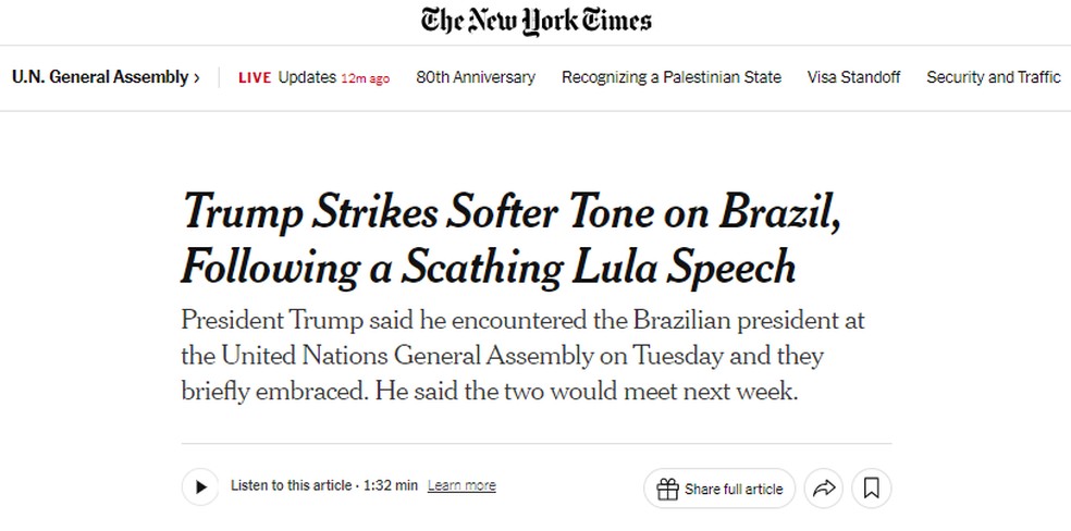 “Seus comentários vieram após um discurso de abertura contundente de Lula na Assembleia, que pareceu mirar indiretamente no líder americano e em suas exigências para que o Brasil interrompa o processo criminal contra o ex-presidente Jair Bolsonaro, aliado de Trump”, destacou o jornal.