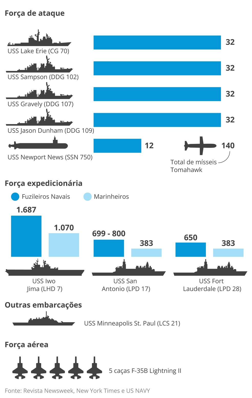 — Pela quantidade de tropas mobilizadas e os tipos de navios de guerra e de aviões que estão nas proximidades, acredito que uma decisão foi tomada. O cenário está se desenhando, já são dois meses de preparação — disse Santoro. — Se confirmado [um ataque direto], será algo inédito na América do Sul.