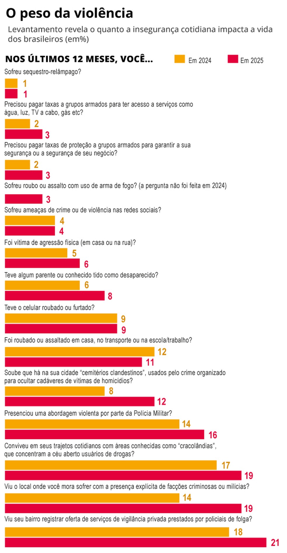 Entre mais de 15 indicadores de violência presentes no levantamento, este foi o único com aumento fora da margem de erro de dois pontos percentuais (veja mais no quadro abaixo). O patamar de entrevistados que respondeu positivamente à pergunta do instituto saltou de 14% para 19% na comparação entre 2024 e 2025.