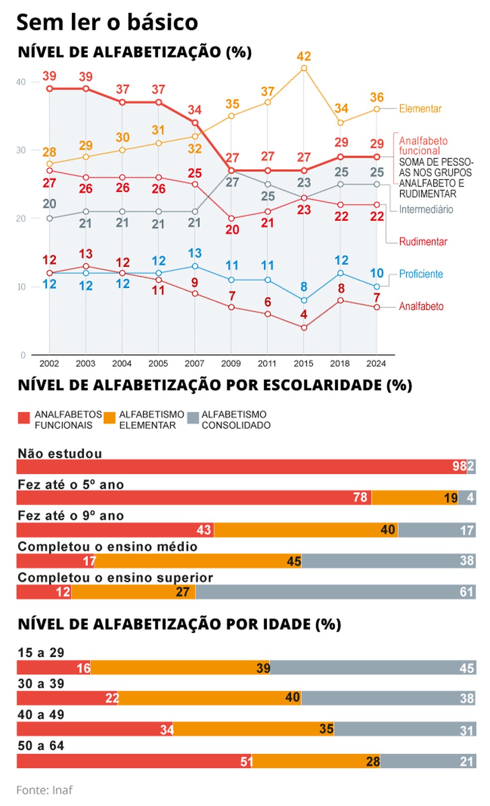 Entre 2018 e 2024, o combate ao analfabetismo funcional não avançou no Brasil. A nova edição do Indicador de Analfabetismo Funcional (Inaf) apontou que 29% dos brasileiros de 15 a 64 anos não aprenderam o básico de leitura e da escrita — mesmo percentual registrado seis anos antes, o último com informações da série histórica. No caso daqueles que completaram o ensino superior, a taxa de analfabetismo funcional é de 12%. Especialistas apontam que crise na Educação de Jovens e Adultos (EJA), modalidade para quem não completou a educação básica, e baixa aprendizagem na idade adequada constroem esse cenário.