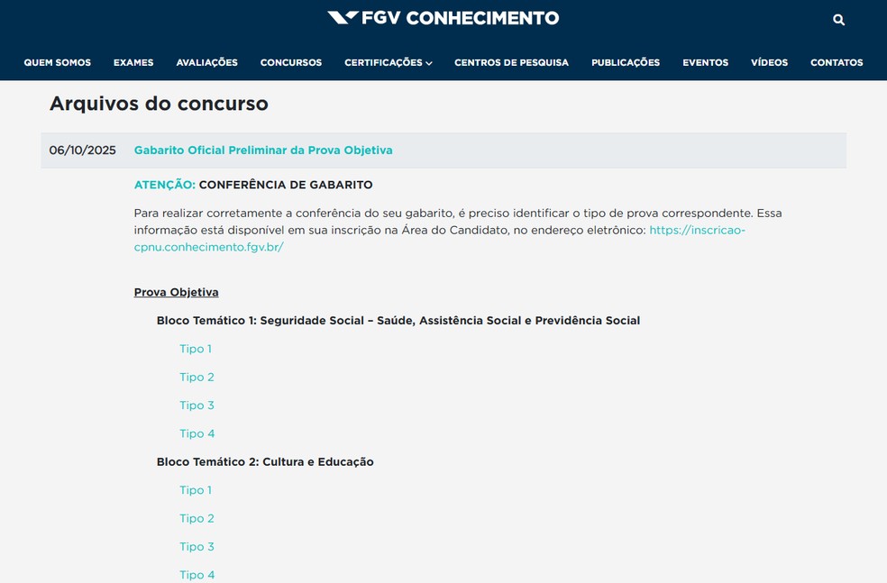 Os gabaritos oficiais das provas objetivas do Concurso Nacional Unificado (CNU) já estão disponíveis no site da Fundação Getúlio Vargas (FGV). Cada bloco teve quatro modelos diferentes de prova, com as mesmas questões, mas em ordem diferente. Portanto, são quatro gabaritos diferentes para cada prova. Veja, a seguir, o passo a passo, com prints, de como acessar os gabaritos e como saber qual prova o candidato realizou.