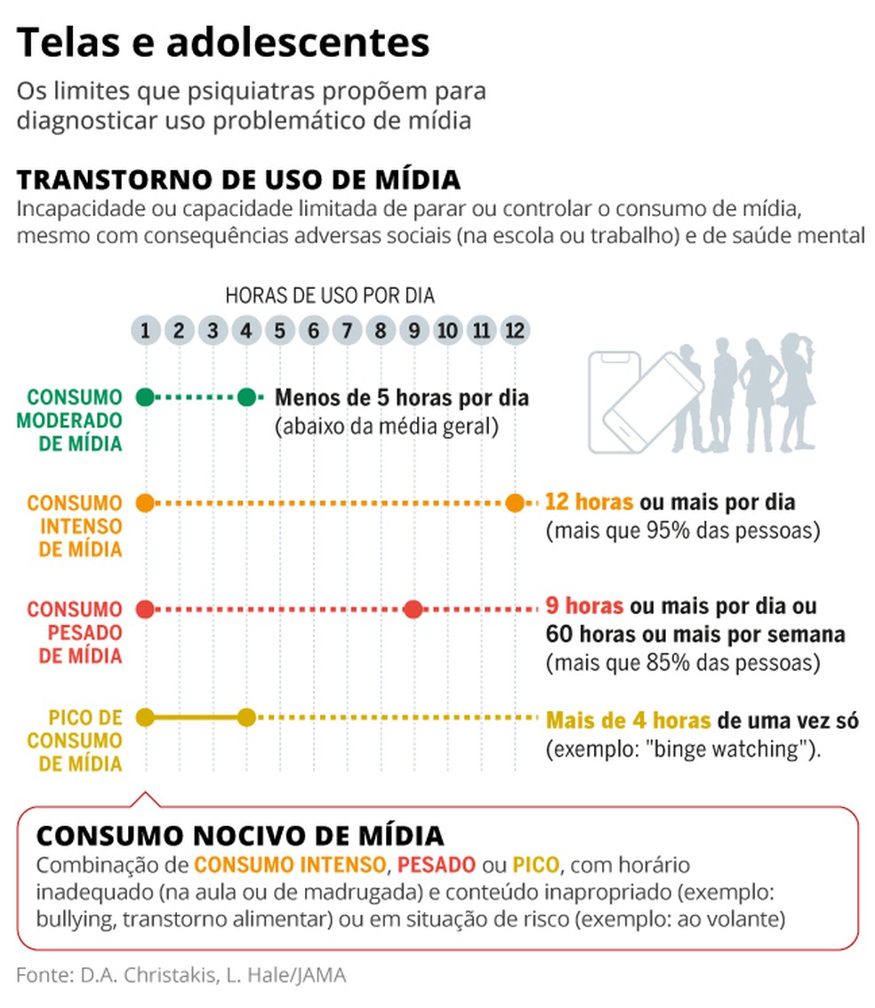 “Introduzir essa classificação não poderia ser mais urgente”, escrevem Hale e Christakis. “Enquanto acadêmicos se alongam em discussões abstratas sobre o assunto, mais de 6 milhões de adolescentes americanos já estão exibindo o que nós chamamos provisoriamente de consumo pesado de mídia, e uma parcela considerável deles provavelmente já sofre de transtorno de uso de mídia.”