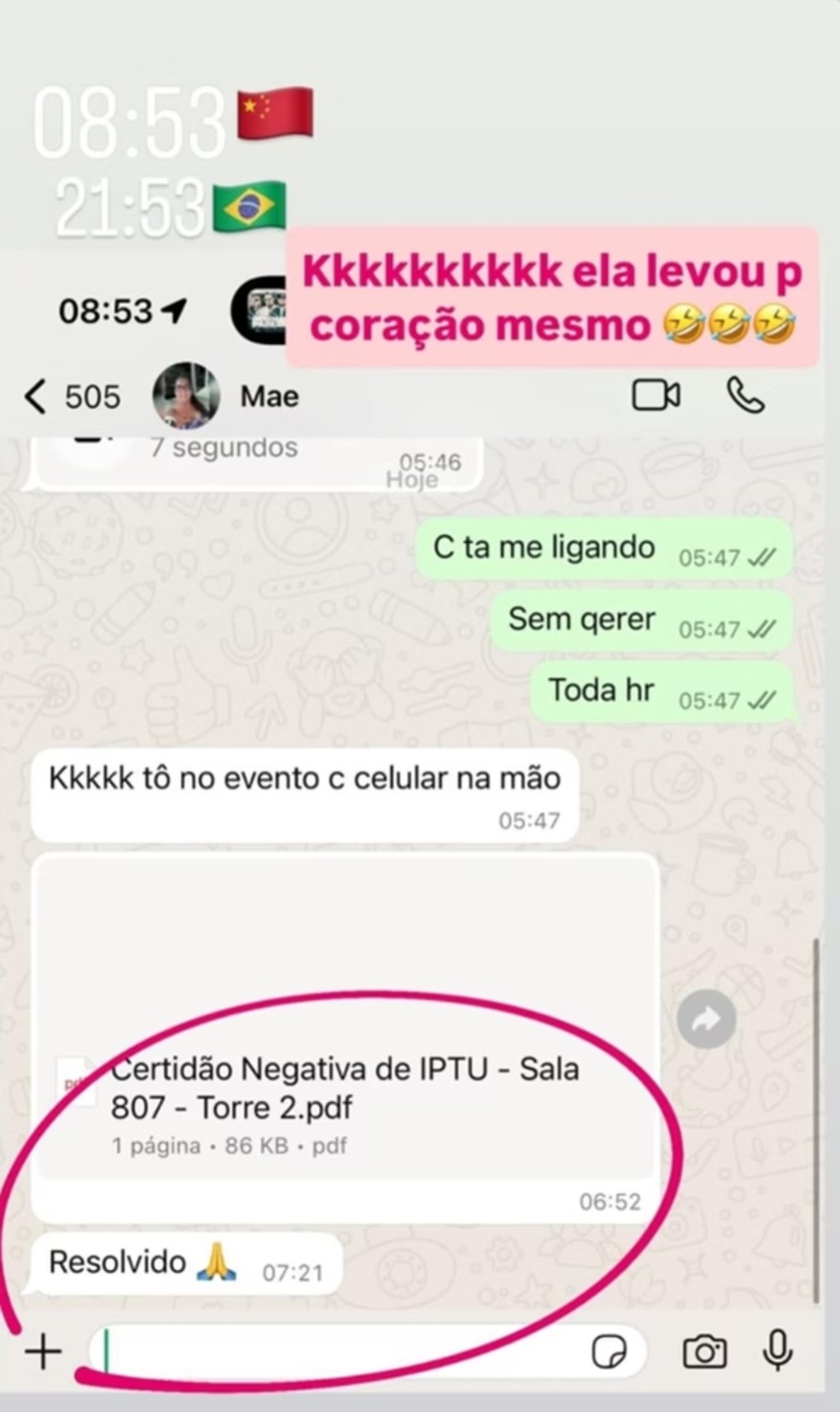 A influenecer, que já estava na China, compartilhou prints de conversas com sua mãem, Margareth Serrão, sobre a regularização da dívida, que ultrapassava R$ 6,5 mil. A pendência, caso não fosse quitada, poderia levar à penhora de bens.
