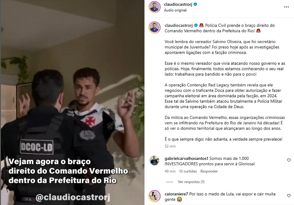 Mais cedo, Castro afirmou em publicação nas redes sociais que a Polícia Civil havia prendido “o braço direito do Comando Vermelho dentro da Prefeitura do Rio” e disse que o vereador trabalhava “para bandido e não para o povo”. O governador acrescentou ainda que organizações criminosas vêm se infiltrando na administração municipal ao longo dos anos.